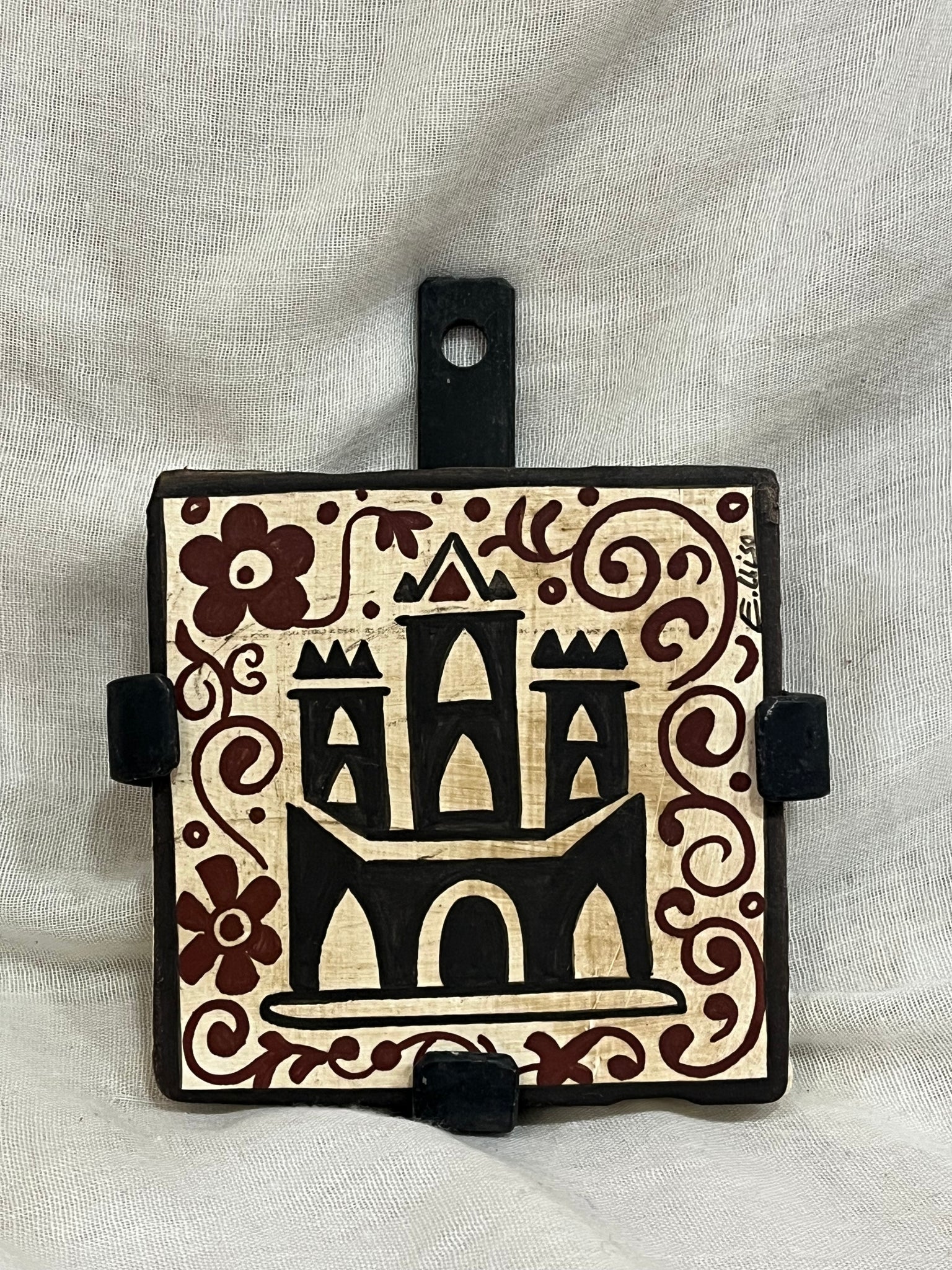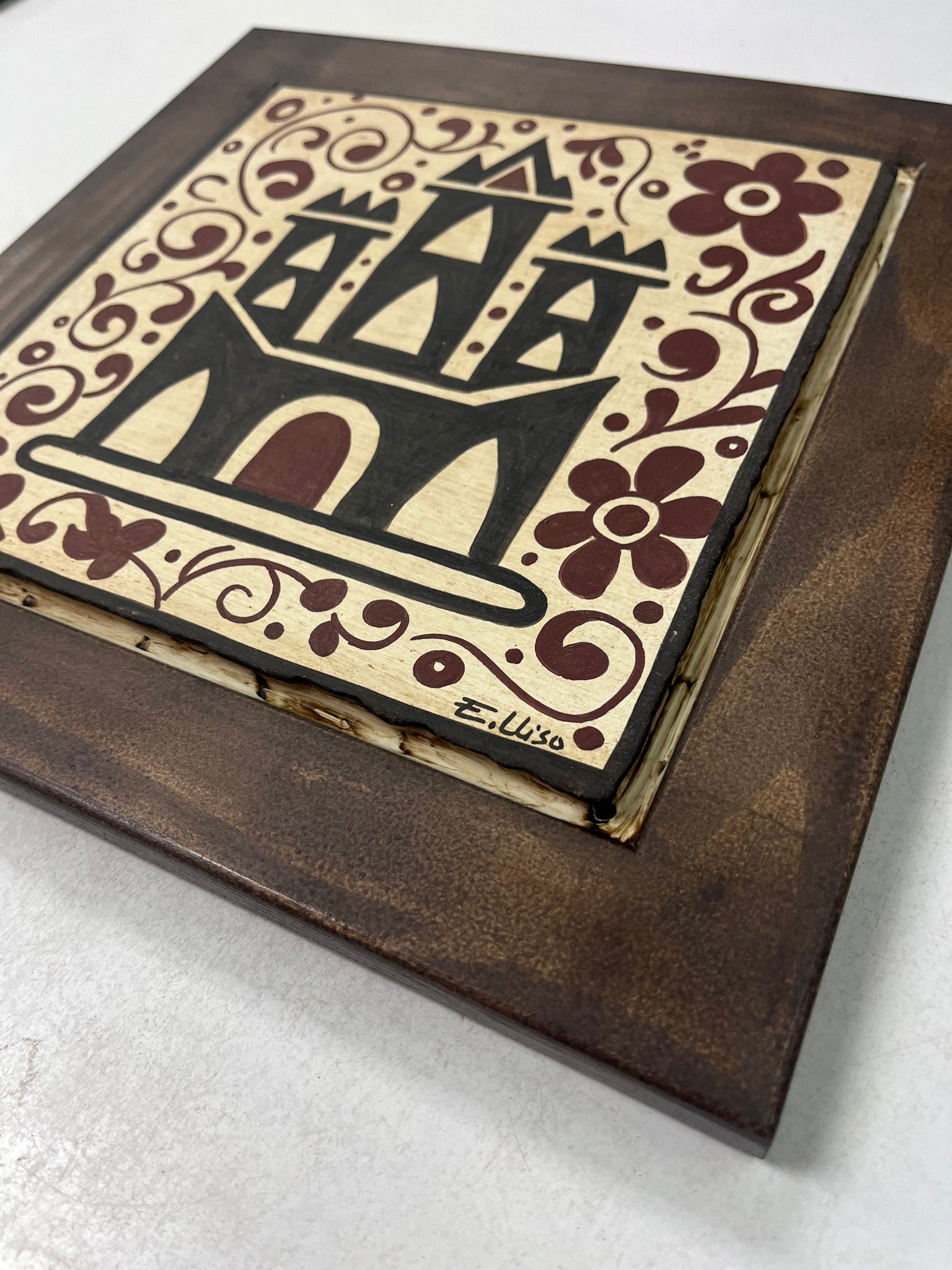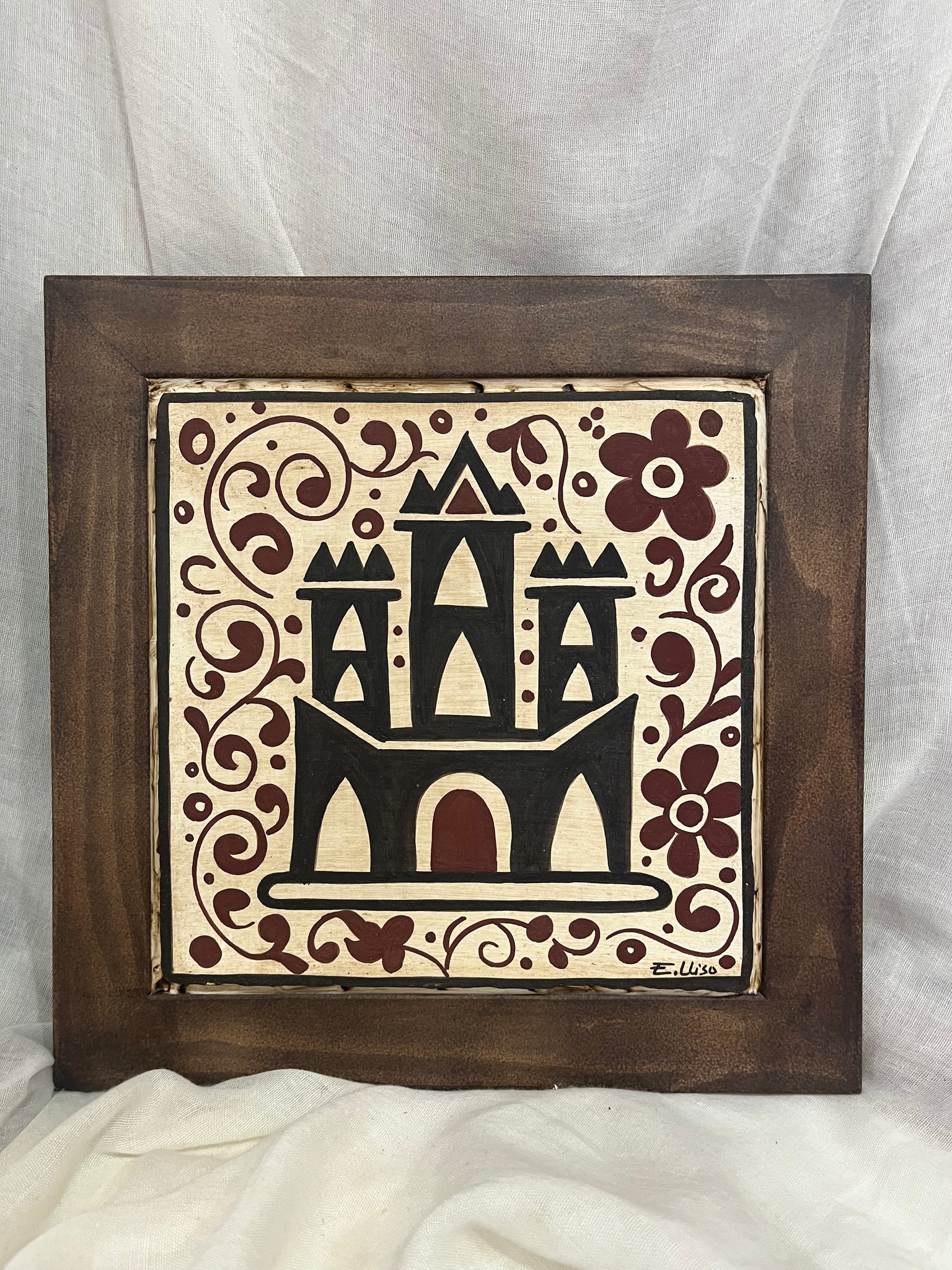 En este taller, realizamos reproducciones fieles a los motivos clásicos. Estos “socarrats” son fieles a la estética medieval. La confección manual de las baldosas y el pintado a mano, confieren a cada pieza un  carácter único e irrepetible. Finalmente realizamos un enmarcado en madera o hierro forjado, que da el acabado medieval definitivo.