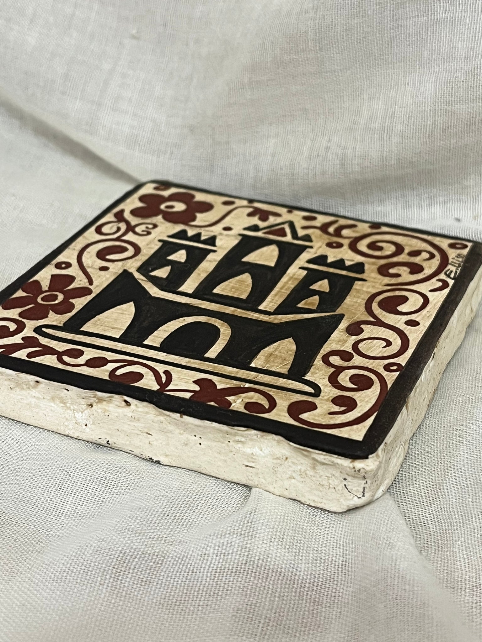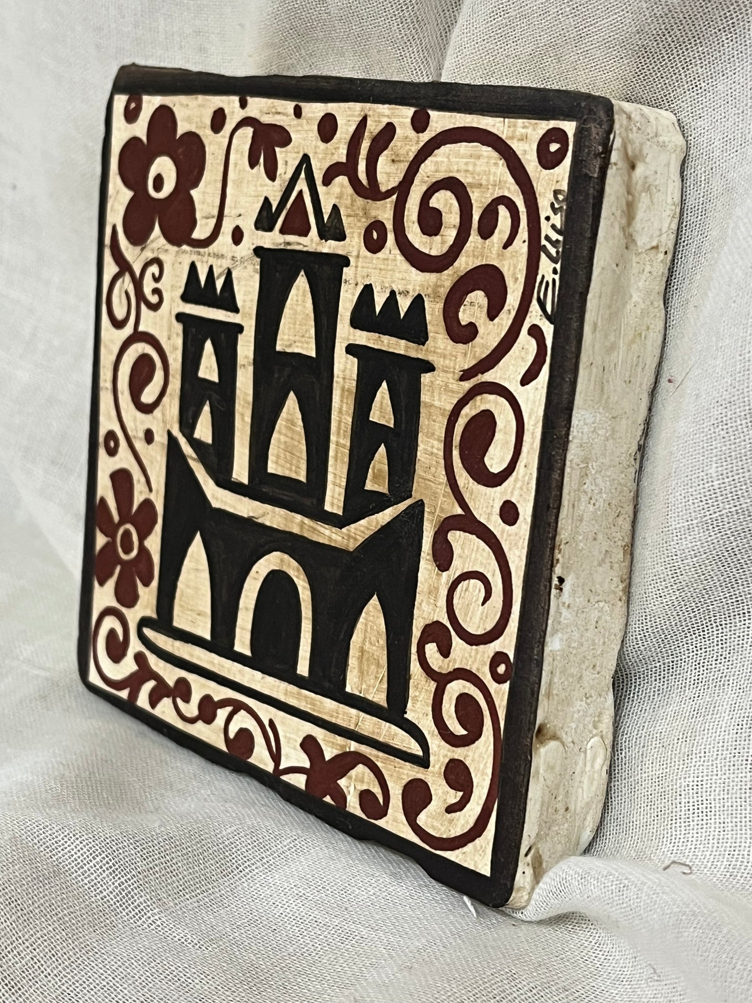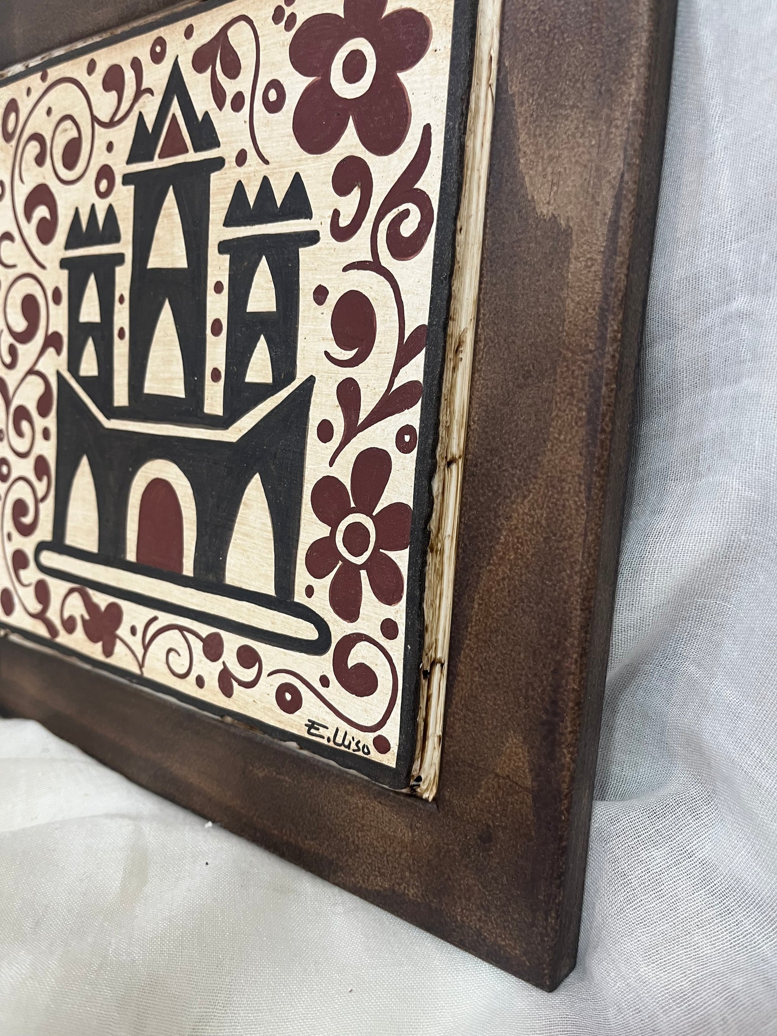 En este taller, realizamos reproducciones fieles a los motivos clásicos. Estos “socarrats” son fieles a la estética medieval. La confección manual de las baldosas y el pintado a mano, confieren a cada pieza un  carácter único e irrepetible. Finalmente realizamos un enmarcado en madera o hierro forjado, que da el acabado medieval definitivo.