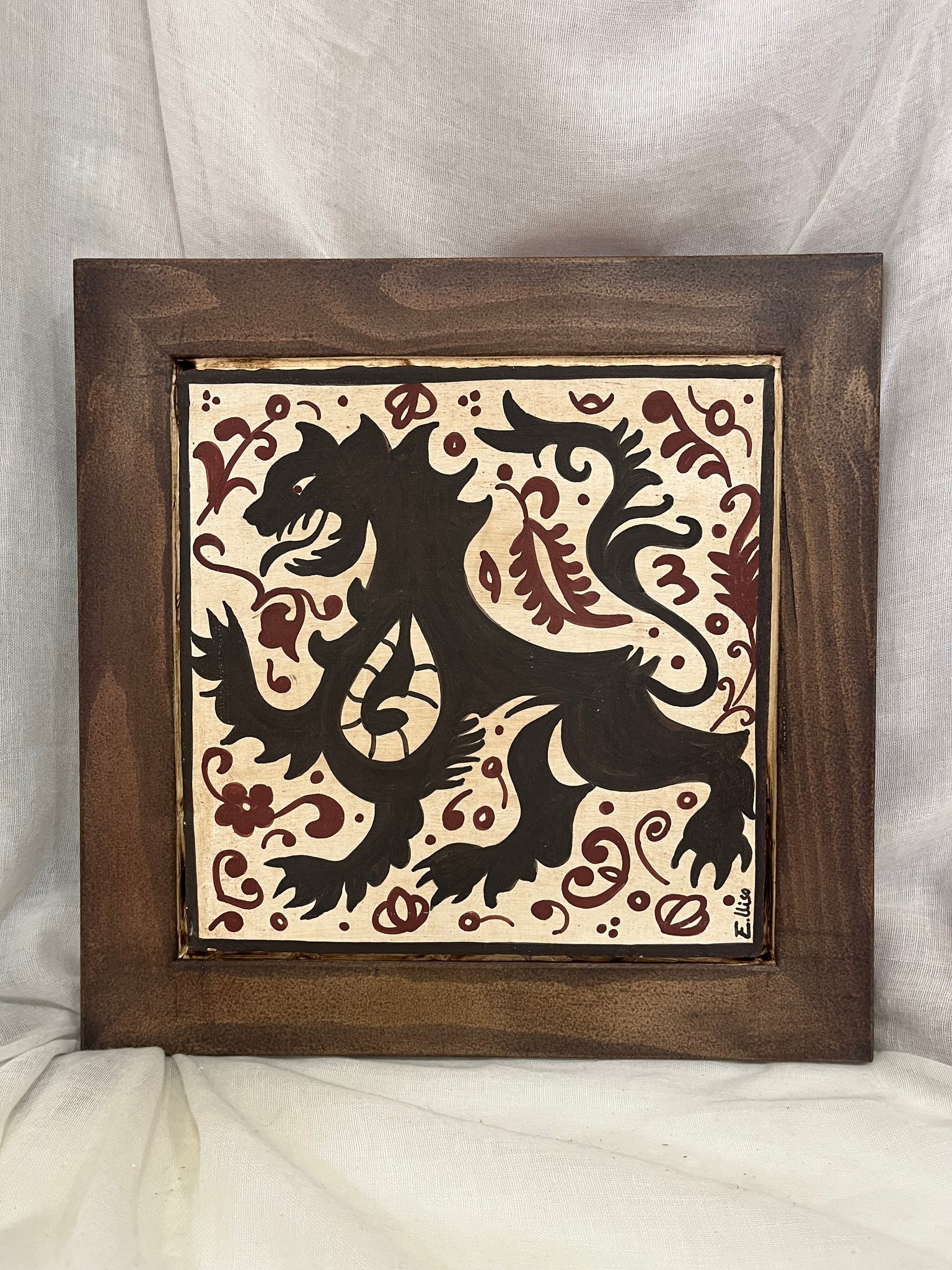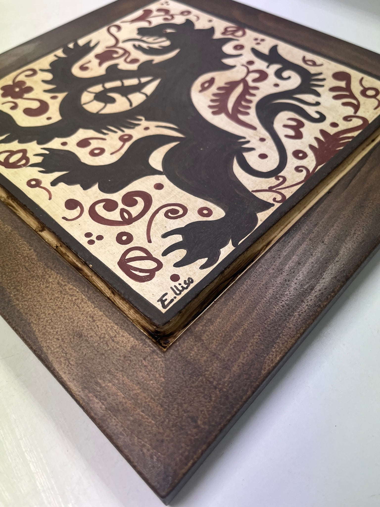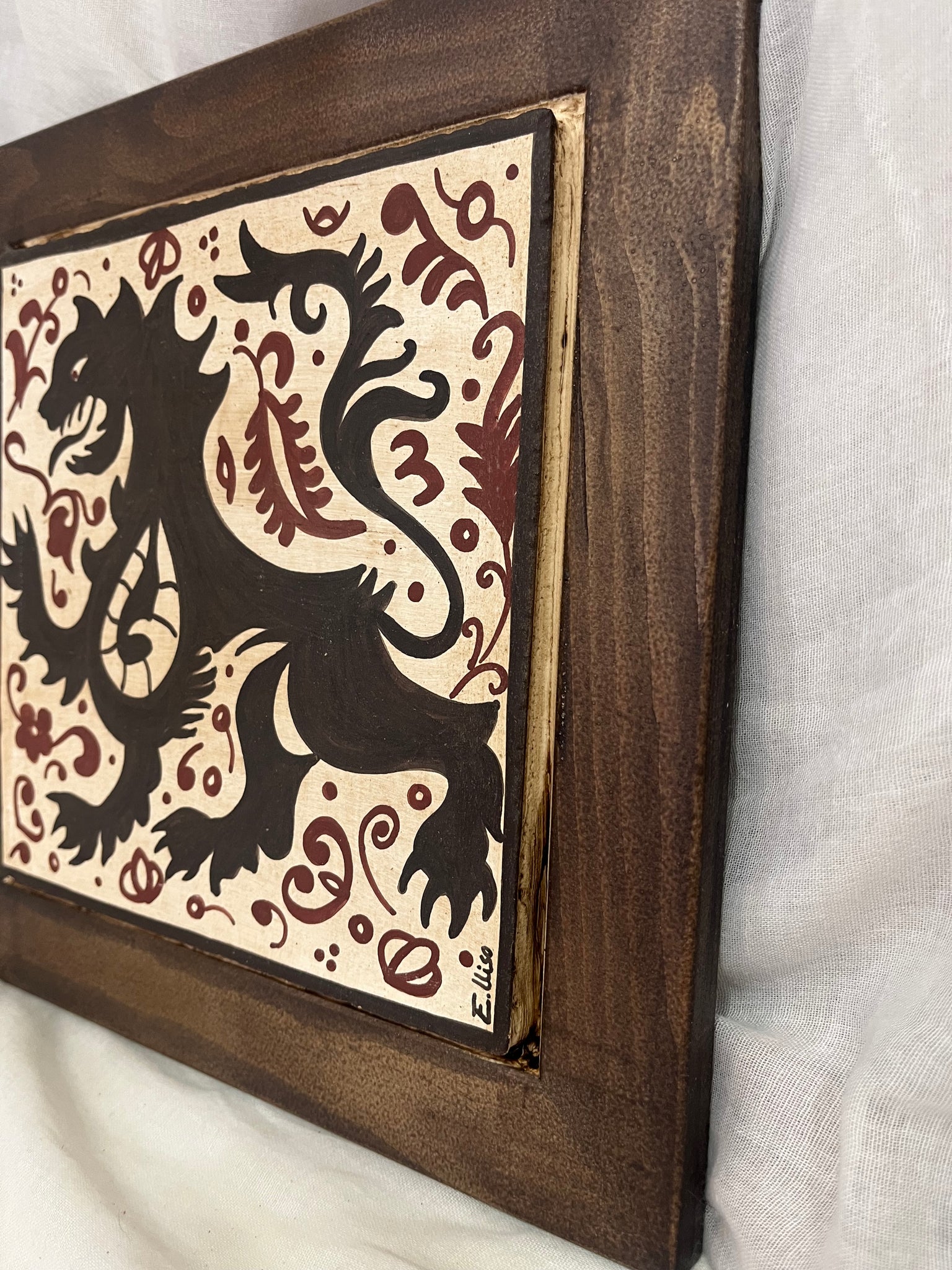 En este taller, realizamos reproducciones fieles a los motivos clásicos. Estos “socarrats” son fieles a la estética medieval. La confección manual de las baldosas y el pintado a mano, confieren a cada pieza un  carácter único e irrepetible. Finalmente realizamos un enmarcado en madera o hierro forjado, que da el acabado medieval definitivo.